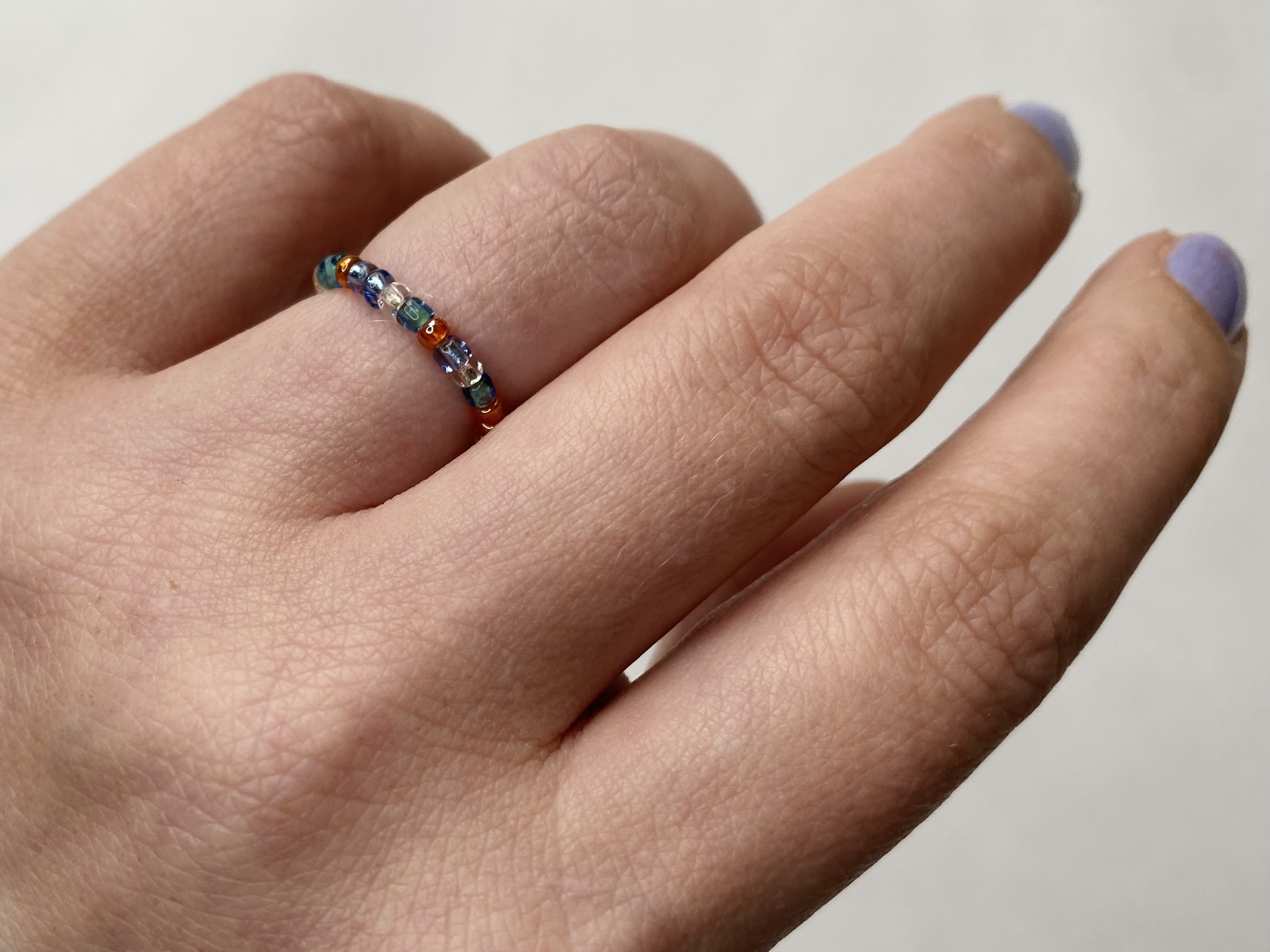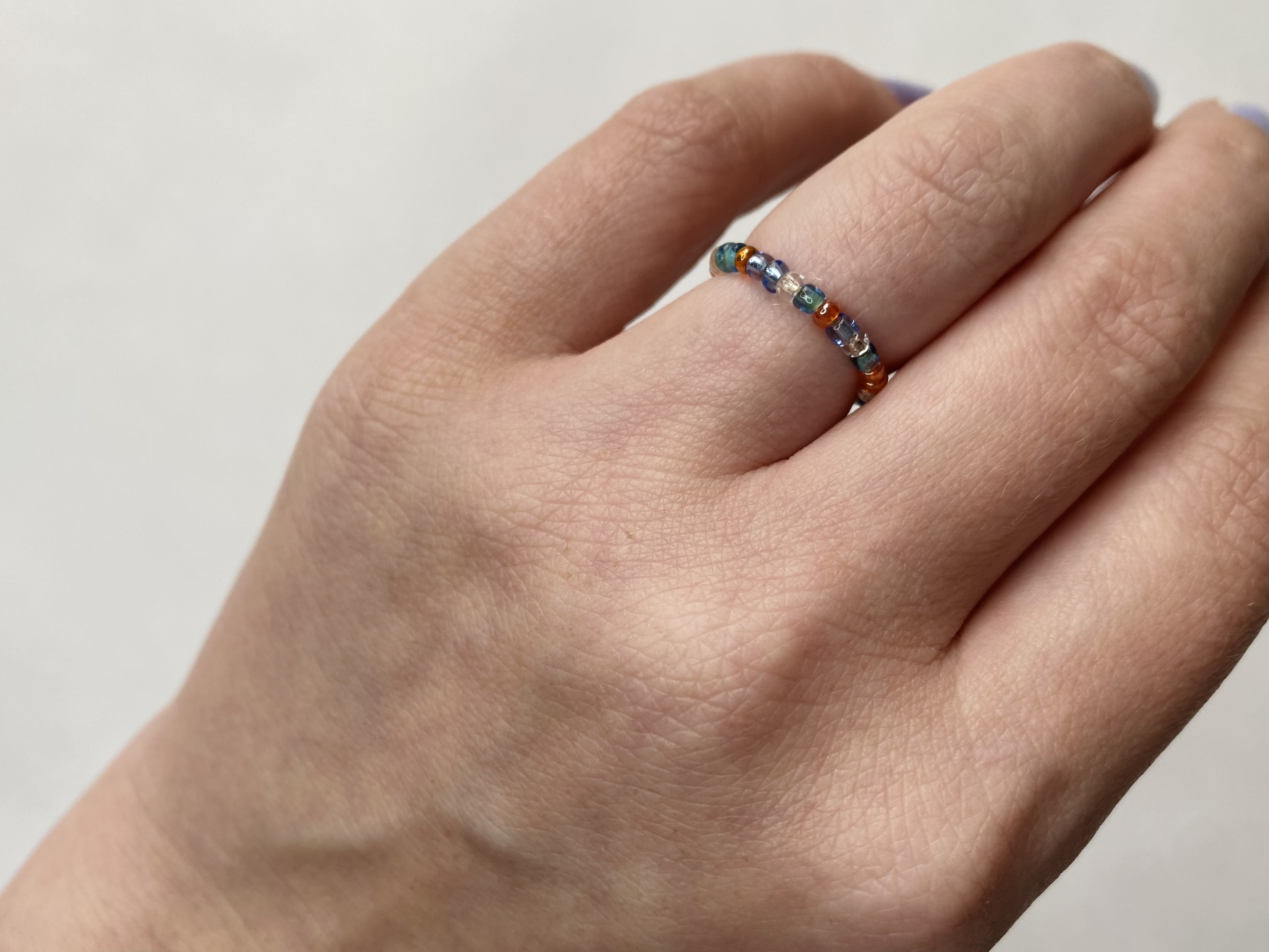- A handmade seed bead ring featuring the color palette of Artisans Cooperative brand (blue, teal, light yellow, peach and salmon)