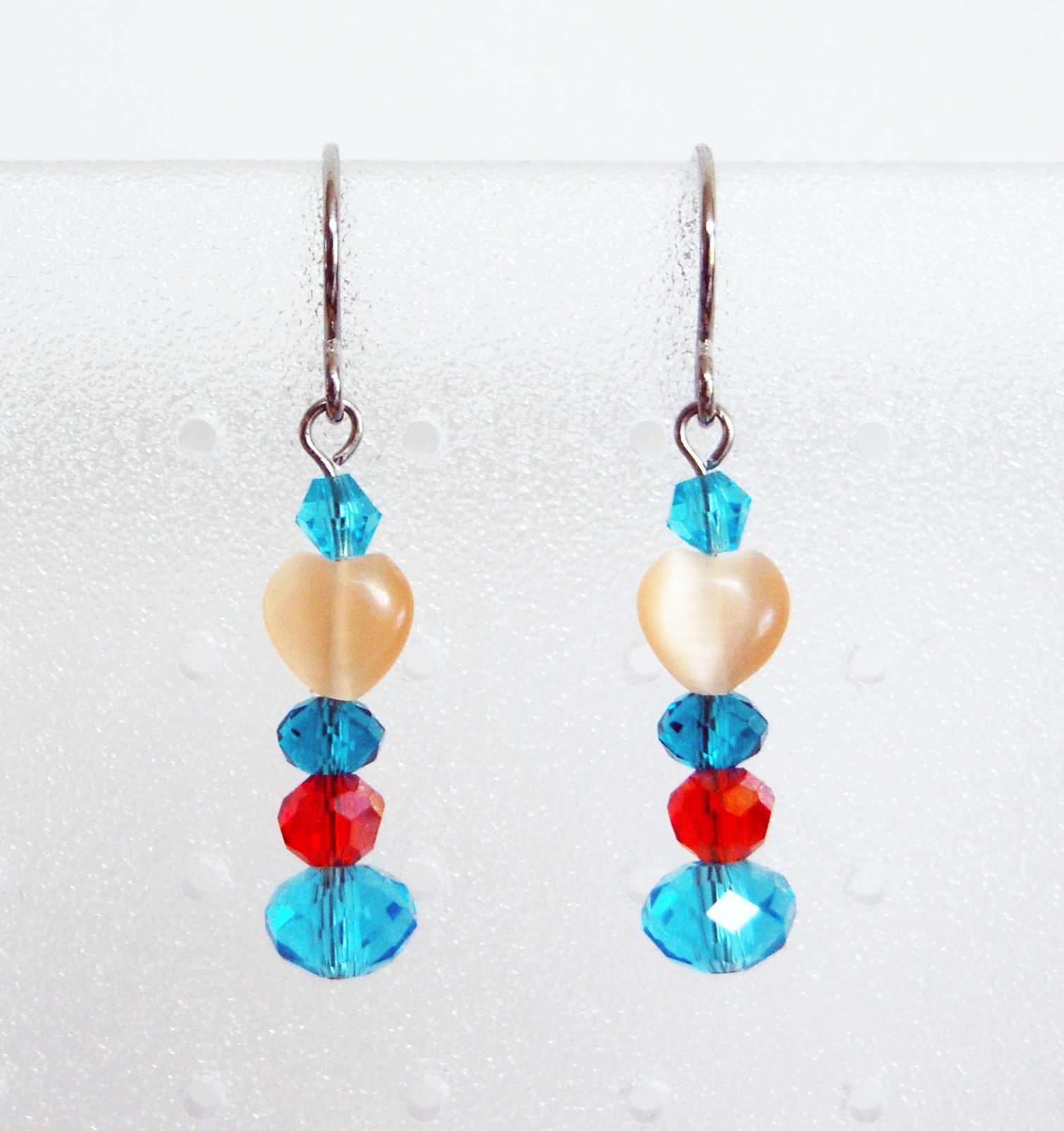 All findings are stainless steel. Faceted crystal beads and cat's eye hearts in shades of teal, blue, red and peach showcase the color palette of Artisans Co-op. The earrings dangle about 7/8 of an inch below the loop of the ear wires. The last listing photo shows the typical way I pack my jewelry creations for shipping. The bubble wrap and tissue paper are clean, reused bits to give them another use instead of going directly to the landfill.